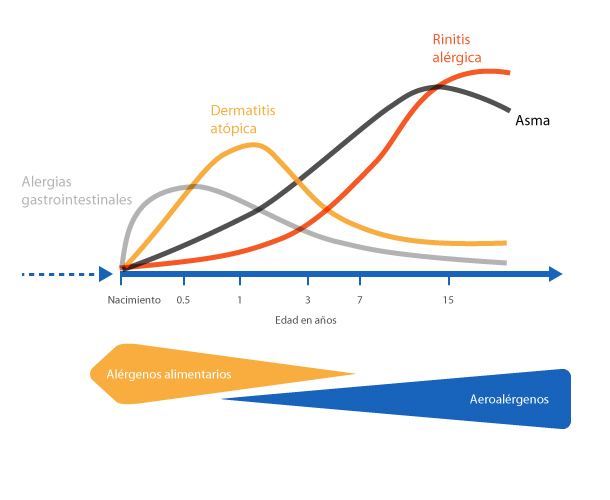 La marcha alérgica se inicia con la sensibilización a los alérgenos alimentarios, que afecta a la piel y al tubo digestivo. La sensibilización a los alérgenos alimentarios se cambia después por una sensibilización a los alérgenos aéreos, que afecta a la vía respiratoria superior e inferior.