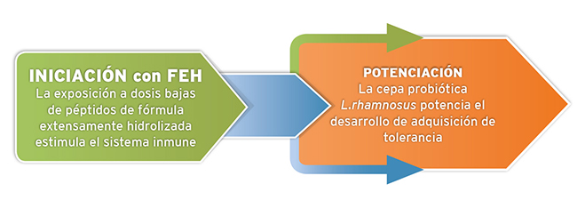 Por tanto, las estrategias más recientes para tratar la alergia a la proteína de la leche de vaca contemplan la adición de probióticos como "Lactobacillus rhamnosus GG" (LGG) para acelerar la adquisición de tolerancia, [Nermes CAAR 2013/Canani 2013] además de evitar las proteínas completas (alérgenos).