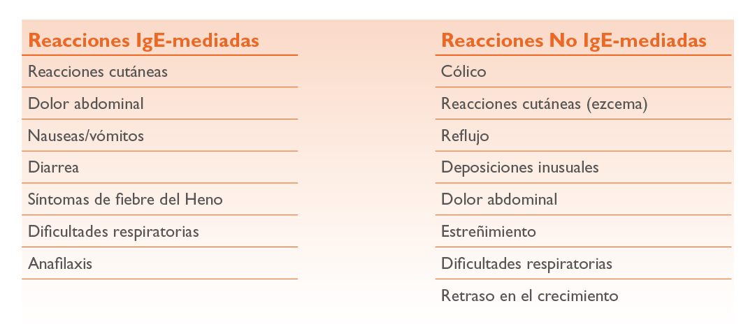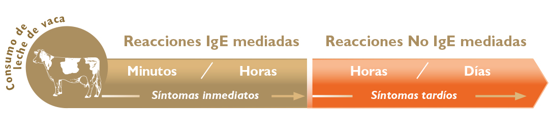 La alergia a la proteína de la leche de vaca se asocia a toda una serie de síntomas digestivos, cutáneos y respiratorios . La aparición de los síntomas puede ser inmediata o retardada, y la reacción a la leche de vaca puede clasificarse como mediada o no mediada por IgE. [Vandenplas]