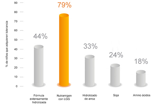 Nutramigen con LGG es la única fórmula para lactantes con alergia a la proteína de la leche de vaca que contiene "Lactobacillus rhamnosus" GG (LGG), con efectos positivos demostrados sobre la alergia a la proteína de la leche de vaca: